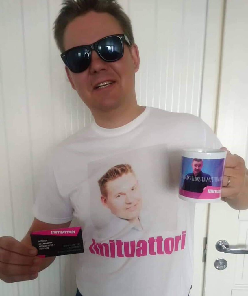 Imituattori Antti Karjalaisen äänirepertuaaria löytyy niin Tarja Halosesta ja Aira Samulinista Antti Tuiskuun tai vaikkapa Kaija Koosta Kuosmasen Sakariin…. Ja näitähän riittää kaikenikäiselle yleisölle hauskuutettavaksi.