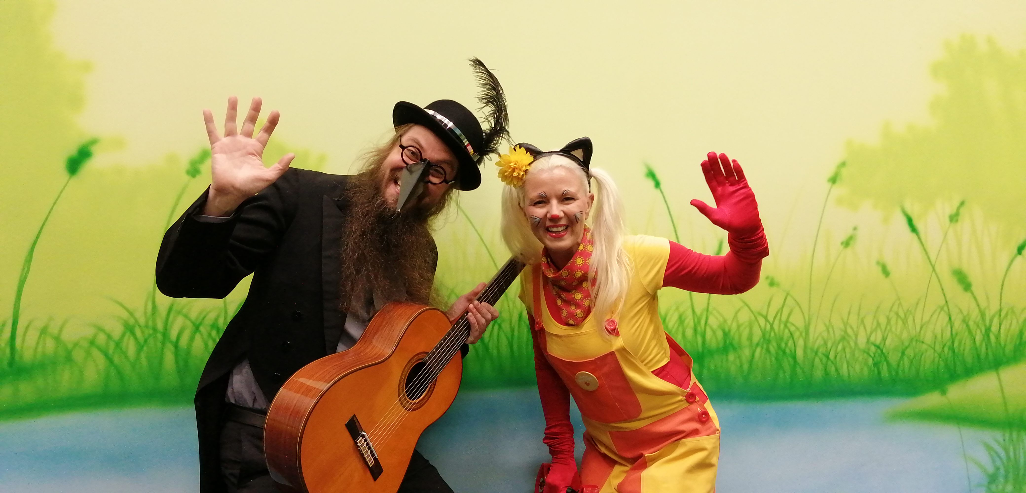 Minttu-Kissa leikittää lapsia ja Pietari Varis säestää laulut kitaralla.